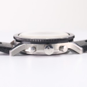 CROWN & PUSHERS: Signed Breitling crown looks very clean and winds and pulls out to the time-setting position as it should. It sits tightly against the case. The two pusher caps are likewise in Excellent shape and both chrono pushers work as they should and also nice and crisply.